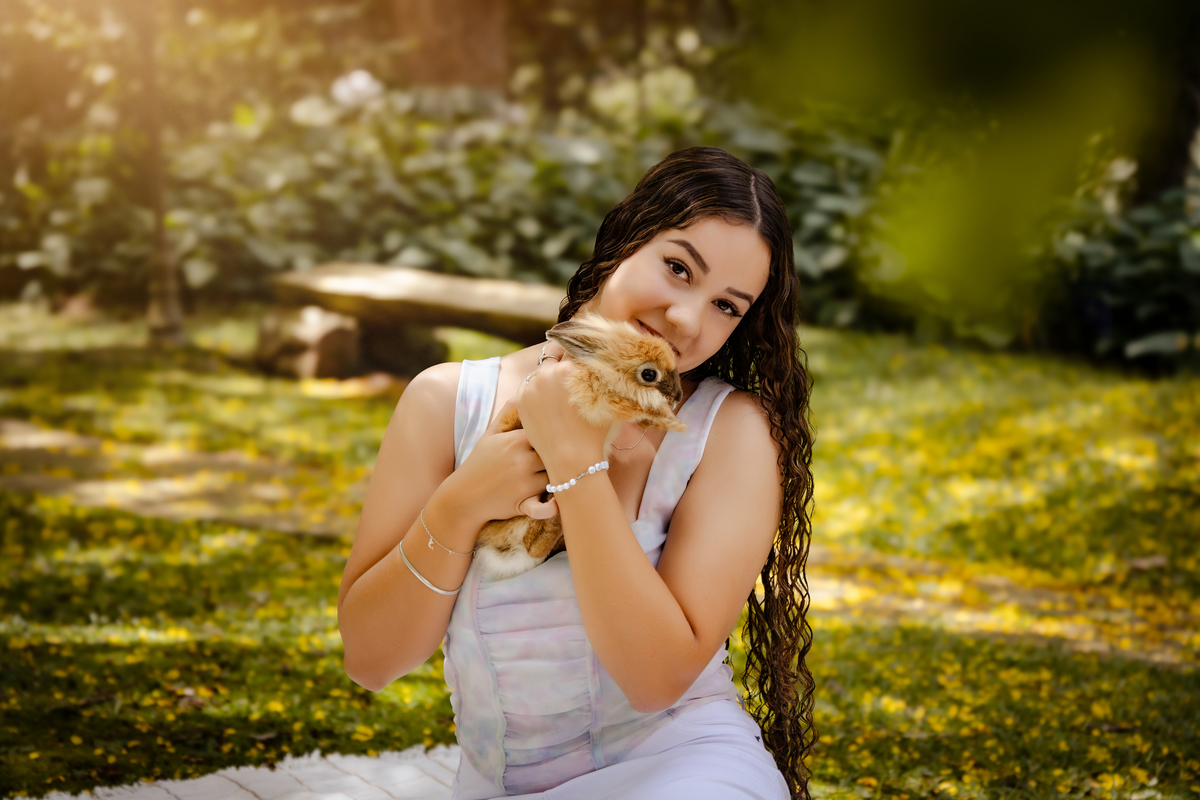 Ela levou um convidado muito especial para o ensaio, o seu coelhinho de estimação Pantufa que roubou a cena com tanta fofura!!